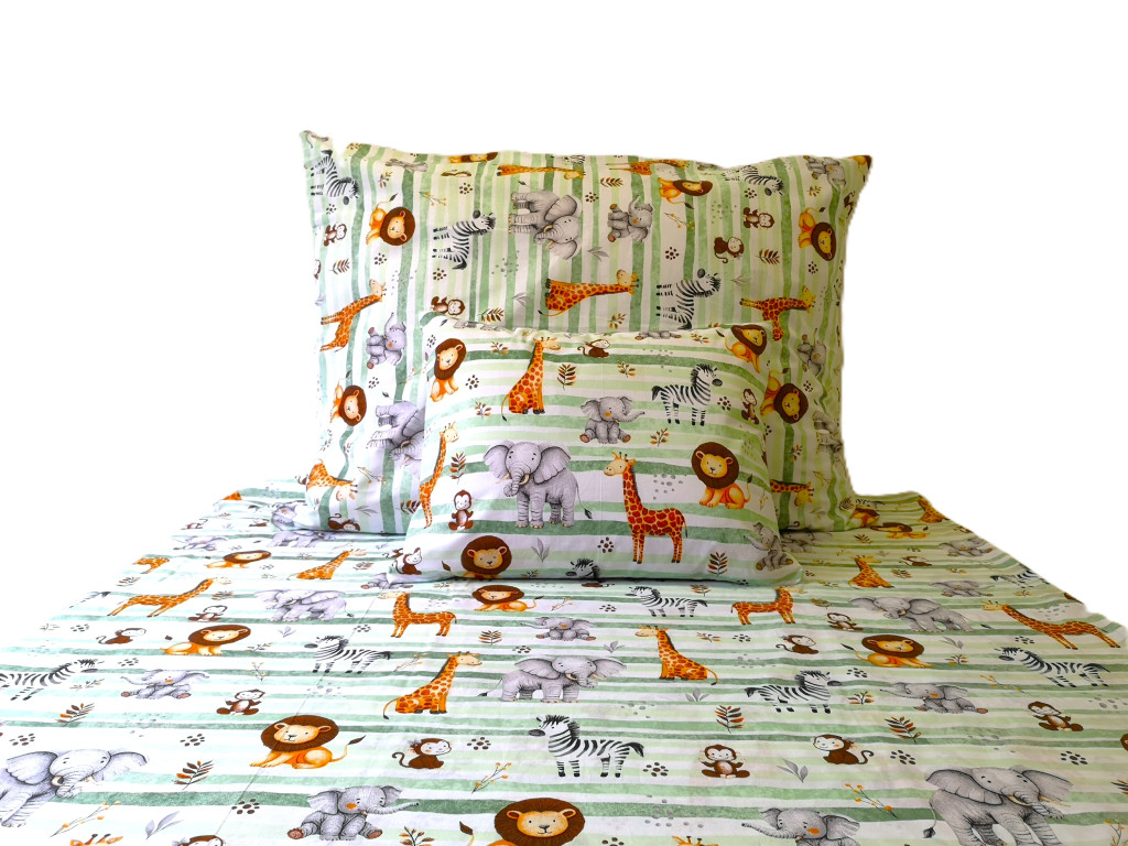 Zöld csíkos szafari állat mintával 3 részes ágyneműhuzat 140x200 cm, 100% pamut alapanyagból.