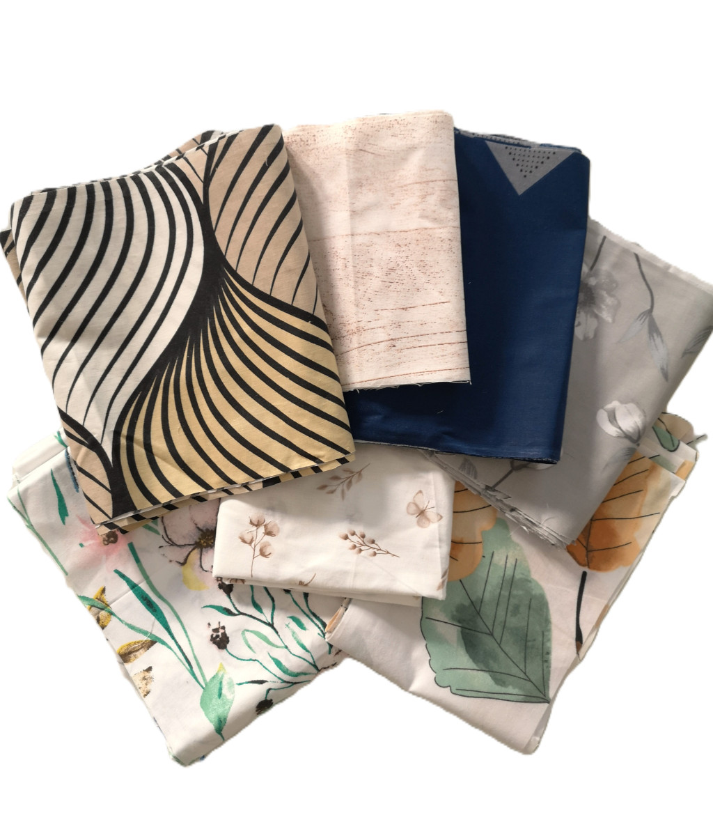 Pamut alapanyagú, patchwork csomag, többféle mintával sötétebb és világosabb színekkel.