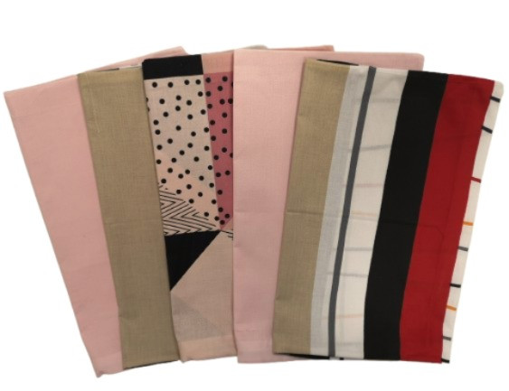 Pamut kispárna huzat csomag 5 db-os, II. osztályú rózsaszín, mályva-fekete pöttyös, bézs-szürke mintás
