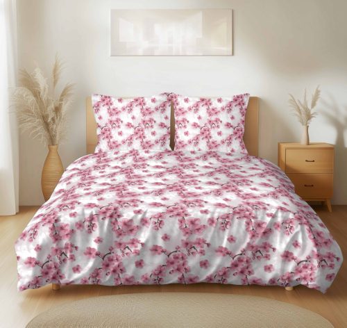 Pamut ágynemű huzat szett fehér alapon rózsaszín cseresznyevirág mintával.