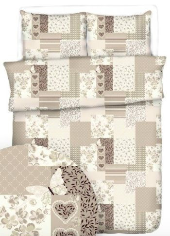 Romantikus hangulatú 100% pamut hosszú ágynemű huzat szett, bézs színű, közkedvelt patchwork mintával.