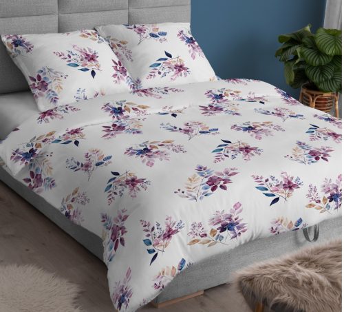 5 részes dupla ágynemű huzat szett - 200x220 cm / fehér alapon mályva virág - kék levél motívumokkal