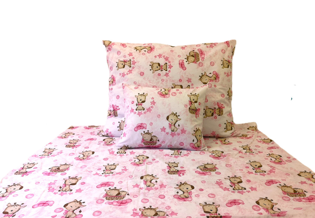 140x200cm-es 3 részes ágynemű huzat garnitúra 100% pamut rózsaszín zsiráf bébi mintával.