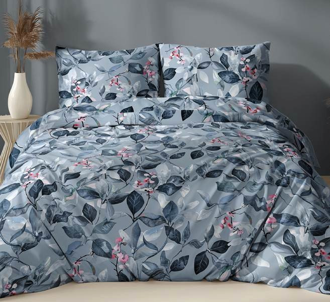 A világoskék alapszínű ágyneműn botanikus minta látható, amely sötétkék és szürkéskék levelekből, valamint kisebb, élénk rózsaszín virágokból áll.