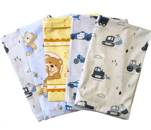 Kispárna huzat szett kisfiúknak II. osztályú, munkagépek, macik és rendőr autók mintákkal.