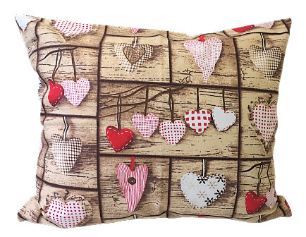 Bézs színű alapon szív mintás, romantikus stílusú pamut kispárna huzat.