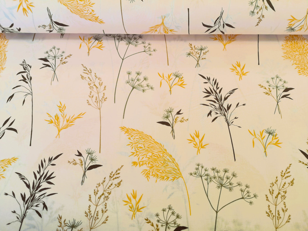 A minta apró, stilizált réti virágokat, füveket és leveleket ábrázol, halvány bézs háttéren.