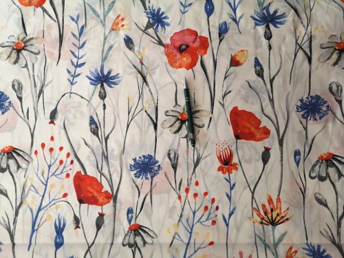 Kellemes - tavaszi hangolatú , piros pipacs -és színes virágok mintázatú 100% pamutvászon textil.