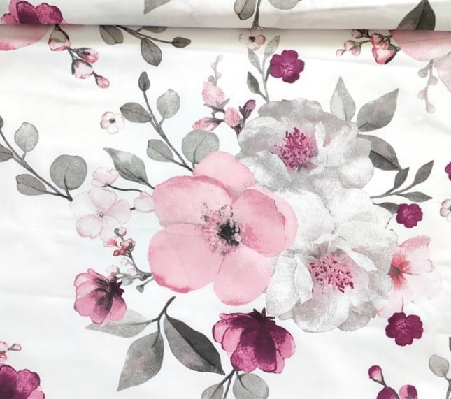 100% pamutvászon, amely fehér alapon romantikus, pasztell rózsaszín és mályva színű, akvarell hatású nagyméretű almavirág mintával díszített.