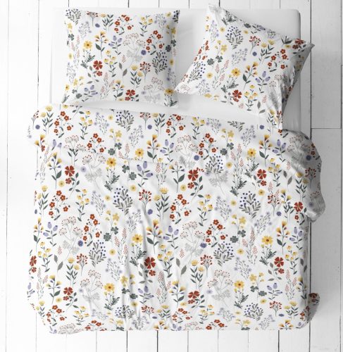 140x200 cm méretű 3 részes valódi krepp ágynemű huzat piros-sárga mezei virágok mintával.