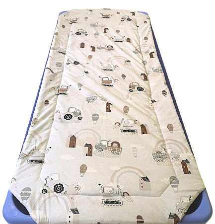 Minőségi ovis töltött gumifüles derékalj igazán fiús halványszürke alapon barna munkagép házikó mintás