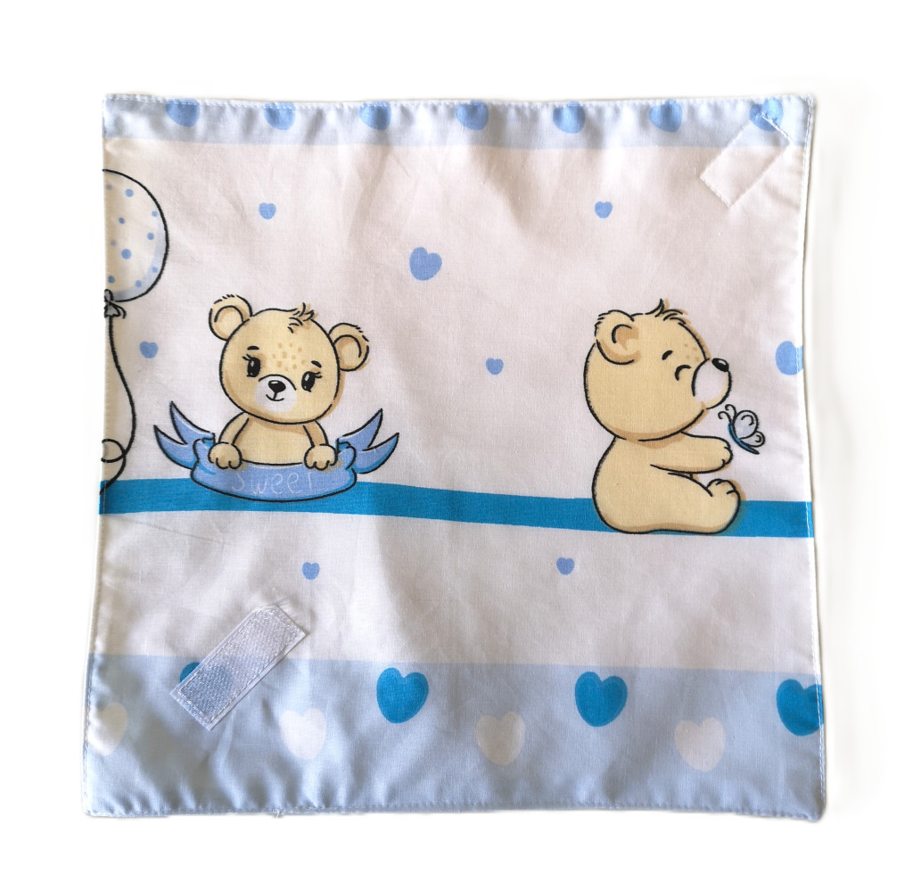 Környezetbarát újraszalvéta babakék szivecskés macik mintával.