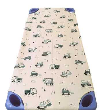 Praktikus és higiénikus megoldás óvodai ágyakhoz, mindennapos használatra petrolzöld munkagépes mintával.
