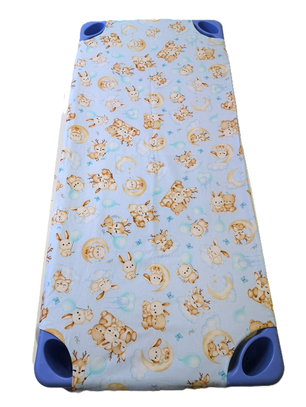 Gumifüles gyermek matracvédő ovis ágyra világoskék cuki állatkölyök motívumokkal.
